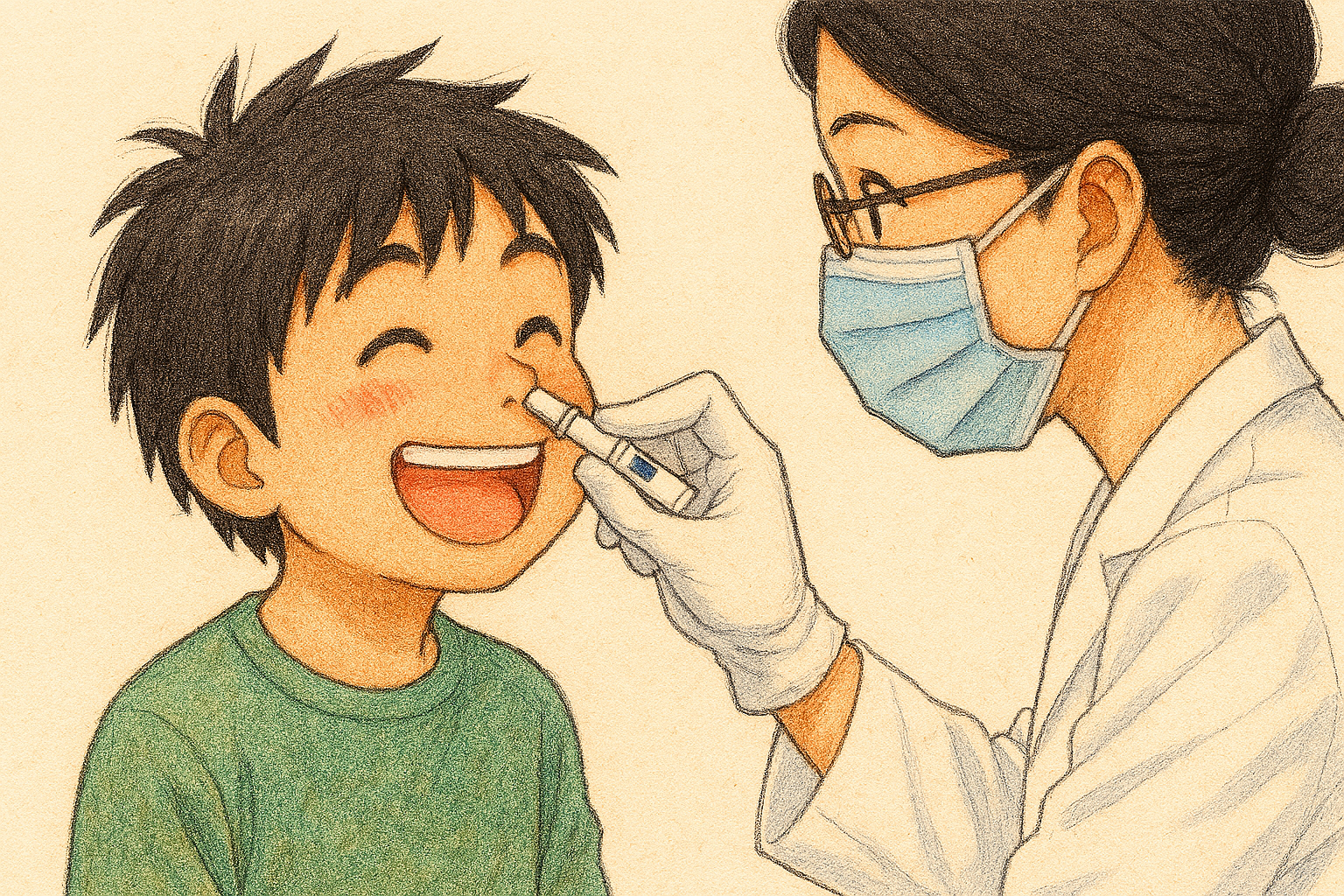- 何といっても注射をしない点です。片側に0.1mlずつ両鼻に噴霧します。効果の持続も皮下注射ワクチンよりも長く続くとされています。1回の接種で済むことも忙しい親御さんには好評です。